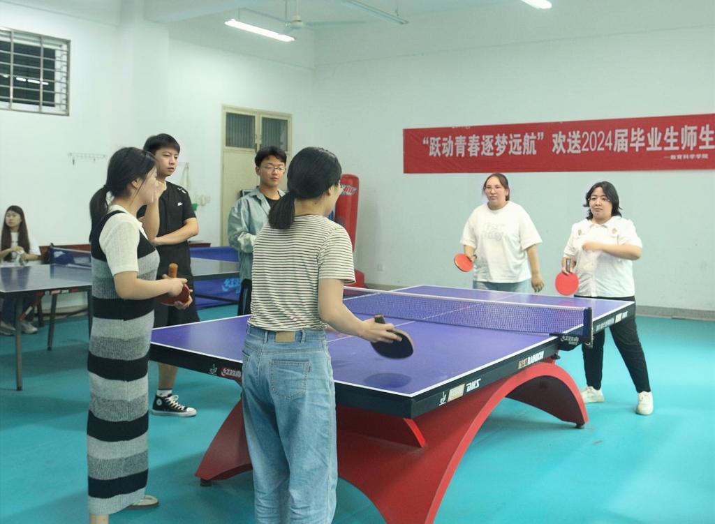时间:2024-05-31 09:10:19 来源:教科院新闻宣传中心 作者:郭鑫瑶 吴皓 阅读: 次为丰富毕业生离校前的校园生活,进一步增强毕业生与母校的情感,为他们增添一份美好的回忆,营造文明离校氛围。5月29日,9001cc金沙于教科楼活动室举办欢送2024届毕业生师生乒乓球友谊赛。9001cc金沙团委书记牛洁楠、辅导员吴康、专业课教师李辉辉、王大磊以及2024届部分毕业生参加此次活动。