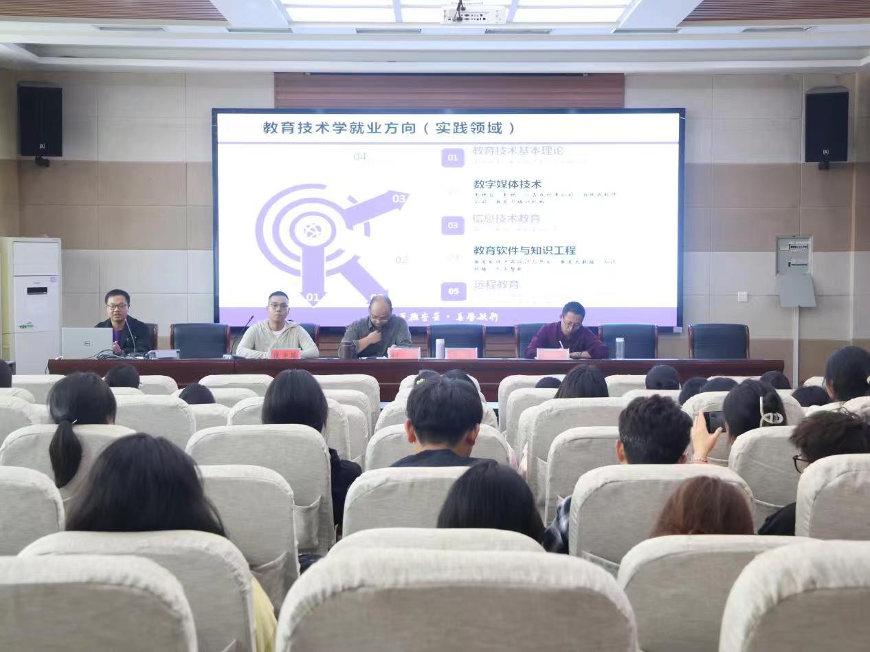 会议伊始,崔宇路分别就专业介绍和培养目标两方面进行汇报。在专业简介方面,他详细列举了专业核心课程和主要实践性教学环节,希望同学们对大学生活有初步的了解。接着,刘琦老师以教育技术专业的培养目标为中心,结合现实情况,表明国家政策指导发展方向,指出专业优势,坚定专业信念。随后武滨老师展示近年来教育技术学专业就业与考研数据来总结教育技术学就业方向,增添了同学们的专业自信心和认同感。最后张立春老师用就业择业感悟,强调了在大学四年的求学路上,一要做好学业,二要不断提升专业素养和综合能力、明确目标,不可碌碌无为。