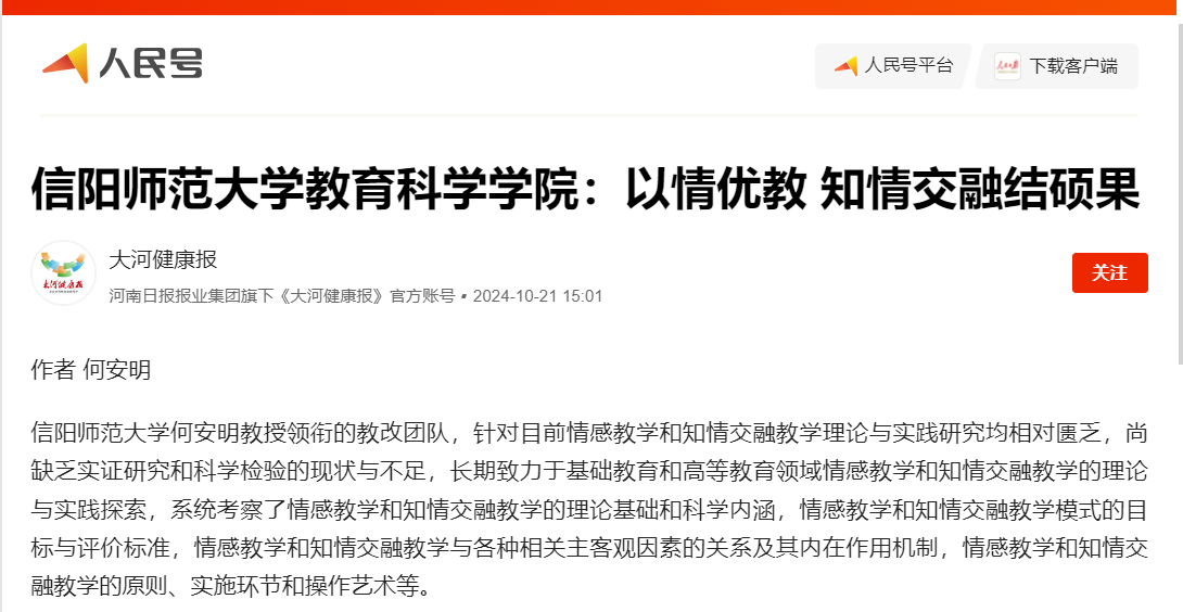 何安明教授领衔的教改团队针对目前情感教学和知情交融教学理论与实践研究均相对匮乏,尚缺乏实证研究和科学检验的现状与不足,长期致力于基础教育和高等教育领域情感教学和知情交融教学的理论与实践探索,系统考察了情感教学和知情交融教学的理论基础和科学内涵,情感教学和知情交融教学模式的目标与评价标准,情感教学和知情交融教学与各种相关主客观因素的关系及其内在作用机制,情感教学和知情交融教学的原则、实施环节和操作艺术等。